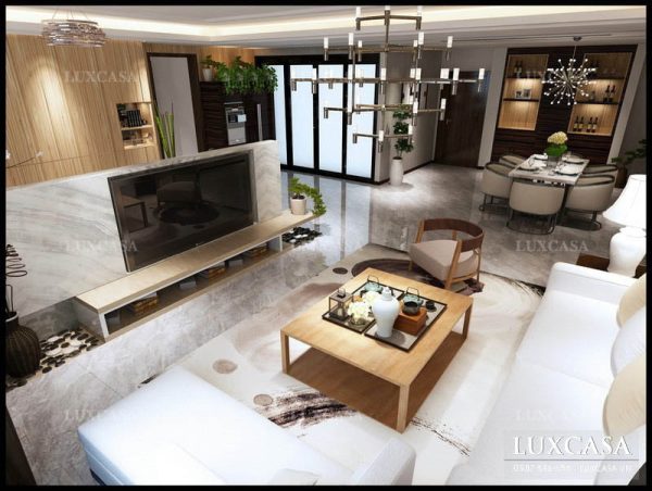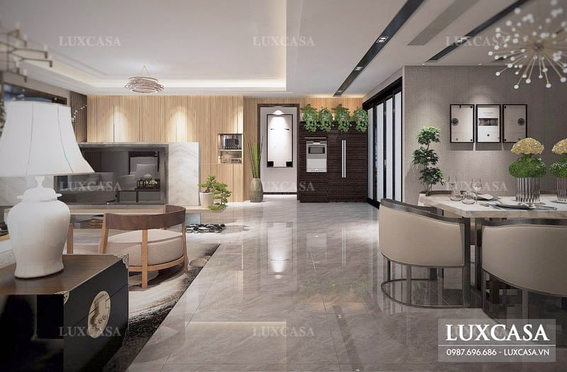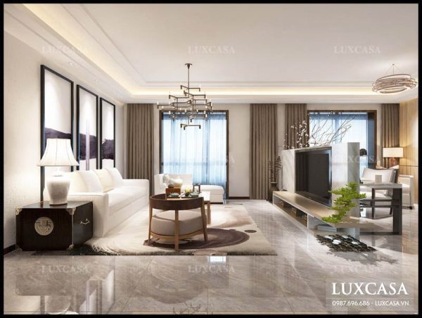 Không gian phòng khách chung cư liền phòng ăn tạo giúp nối liền, tạo cảm giác rộng rãi khi sử dụng. Phòng khách chỉ sử dụng những đồ vật thật sự cần thiết như sô pha văng màu trắng và bàn trà bằng gỗ đơn giản. Phía trên bàn uống nước là bộ trà cụ đặc trưng của phong cách Á đông. Kệ tivi bằng gỗ dáng chữ I với ngăn đồ nhỏ phía dưới được tận dụng. Nền chung cư dùng gạch ốp giả đá tạo cảm giác như đang hòa mình với thiên nhiên. Phía trần nhà treo đèn chùm hiện đại với các tầng bóng đèn nhỏ hình trụ. Bên cạnh đó là khu vực bàn ăn ấm áp với đèn chiếu sáng trang trí dạng pháo hoa và tủ đựng rượu. Bộ ghế ăn bọc da đơn giản, thanh lịch hòa quyện đồng bộ cùng phong cách thiết kế chung cư Á đông. Thiết kế cửa sổ sát đất thu sáng tối đa giúp chung cư nhiều ánh sáng hơn.
