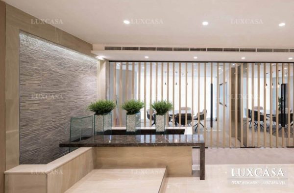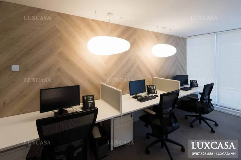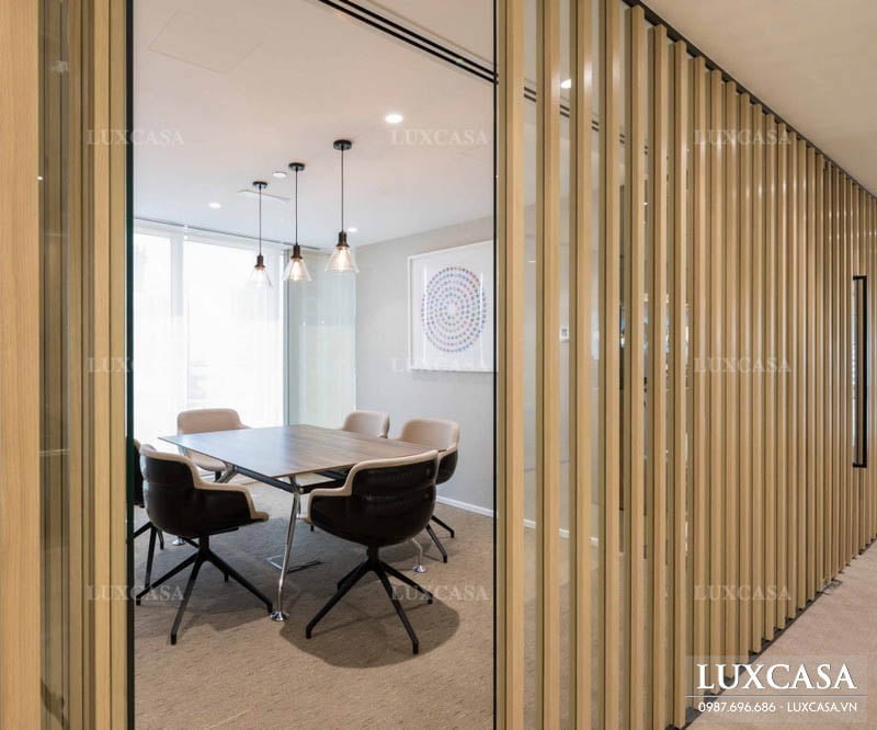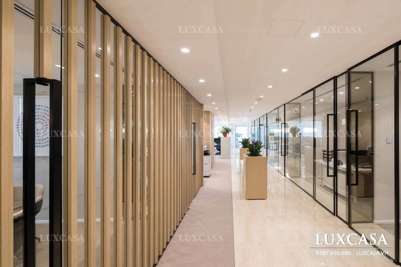 Vách ngăn tại công ty này được đội ngũ nhân viên Luxcasa thiết kế theo dạng vách đan xen. Mỗi vách ngăn được tạo ra nhằm tô điểm thêm cho không gian làm việc thêm phần ấn tượng.