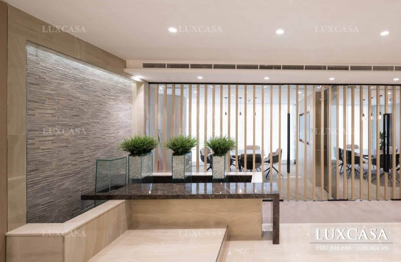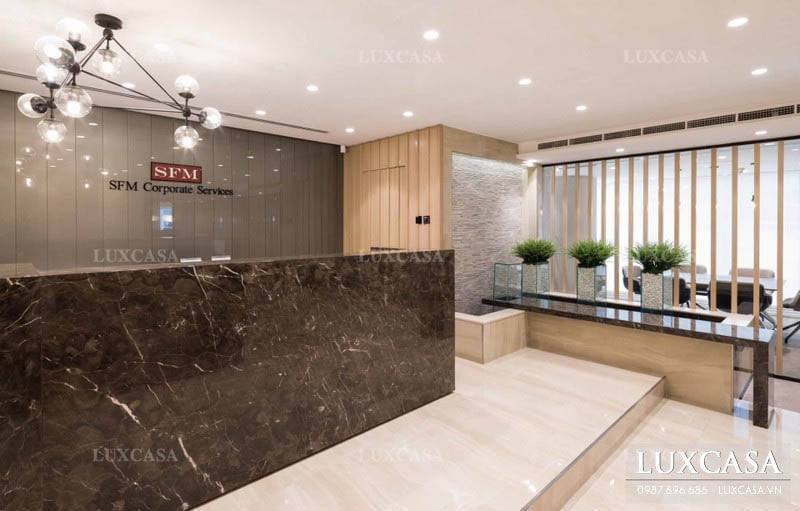 Bàn lễ tân là vị trí đặc biệt quan trọng. Không gian này được ví như bộ mặt của công ty. Do đó, Luxcasa đã đặc biệt chú ý đến phần thiết kế bàn lễ tân này. Bàn lễ tân công ty được đặt tại vị trí góc bên sát tường, đáng chú ý ở không gian công ty. Nhân viên Luxcasa đã khéo léo tư vấn thiết kế văn phòng theo gam màu trầm nâu đen và trắng sáng của gỗ hòa quyện tạo nên không gian ấm áp. Đây chính là điểm đặc biệt khiến không gian phòng trở nên sang trọng.