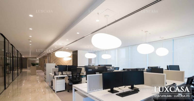 Bên cạnh ánh sáng tự nhiên thì đèn điện chiếu sáng văn phòng là rất cần thiết. Các bóng đèn led sát trần sắp xếp thành hàng giúp cả công ty sáng đều. Đồng thời có thêm đèn thả hình bầu dục để sáng rõ hơn theo vị trí. Hệ thống cửa kính vừa có tác dụng thu sáng và cách âm, tiết kiệm chi phí thi công.