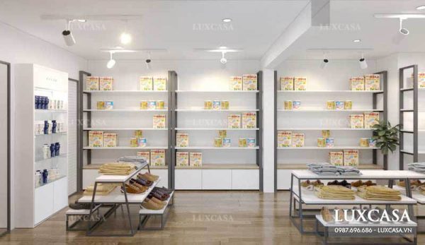 Với mẫu thiết kế này thì nhà thiết kế đã lựa chọn những chiếc đèn âm trần kết hợp với đèn treo trần chiếu sáng và các sản phẩm. Điều này tạo ra hiệu ứng rất tốt cho sản phẩm, với ánh sáng trắng rực rỡ chúng sẽ làm cho các sản phẩm nổi bật hơn và thu hút được thị giác của các khách hàng.