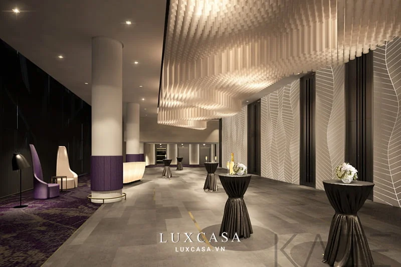 Tại đây chúng tôi sử dụng những chiếc bàn đứng để khách hàng có thể tiếp đón khách mời. Một lọ hoa nhỏ, một chai champagne và những chiếc ly được đặt trên mặt bàn sẽ trở thành những chi tiết nhỏ nhưng vẫn làm nên đẳng cấp cho các buổi tiệc hạng sang. Những họa tiết uốn lượn trên kết hợp hoàn hảo cùng ánh sáng nhẹ nhàng từ hệ thống đèn chiếu sáng góp phần làm toát nên sự sang trọng cho thiết kế của khu vực sảnh.
