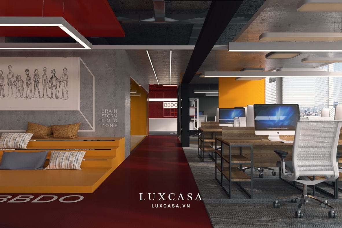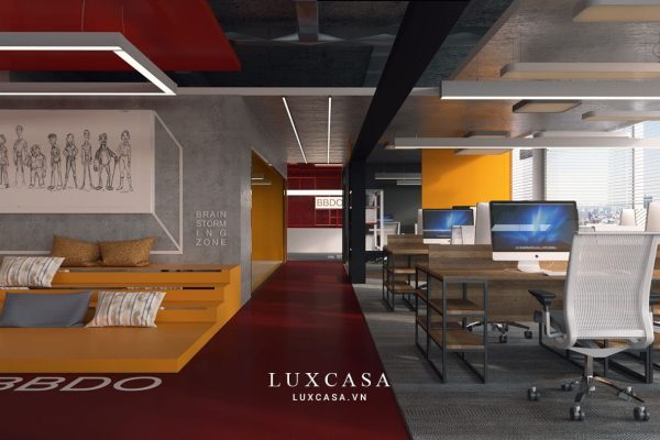 Thiết kế Thi công nội thất công ty BBDO Design hướng tới lối nội thất hiện đại, nhờ cách thiết kế này mà BBDO Design có được không gian làm việc hiệu quả cho nhân viên. Trang trí văn phòng với sắc đỏ nổi bật, nguyên tắc thiết kế văn phòng đẹp mà Luxcasa đặt ra đã tạo nên không gian làm việc ấn tượng. Có thể thấy, văn phòng BBDO Design vô cùng độc đáo từ trong ra ngoài.