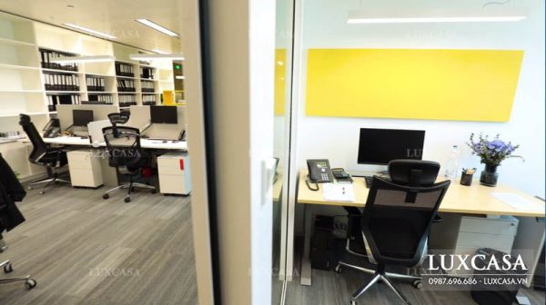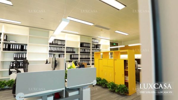Sau quầy lễ tân là các phòng ban chức năng làm việc. Thiết kế nội thất văn phòng nhân viên hiện đại nên các đồ nội thất có kích thước vừa đủ, tích hợp tủ cá nhân và vách ngăn. Tận dụng tủ tài liệu đứng làm vách ngăn nhỏ, tủ trang trí và đặt tại vị trí trung tâm để nhân viên dễ sử dụng. Điều này đảm bảo sự riêng tư nhất định mà không mất việc kết nối. Trong văn phòng có bố trí thêm máy photo, máy in trong góc tiện sử dụng. Áp sát tường là tủ có các ô vách màu trắng. Các bàn ghế ngồi nhân viên bố trí theo nhóm 4 người đặt theo trục di chuyển từ quầy lễ tân vào. Các cửa sổ kính xen kẽ giúp thu sáng, kết hợp đèn trần, đèn led thả cung cấp đủ ánh sáng trong quá trình công tác.