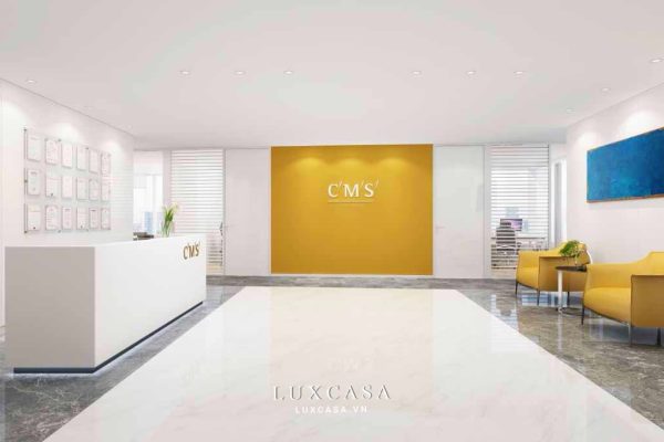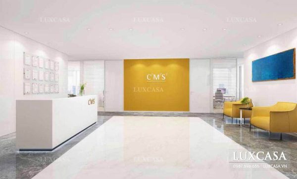 Màu sắc chủ đạo cho văn phòng là sắc vàng với các cường độ màu khác nhau. Khi thiết kế quầy lễ tân văn phòng, các kiến trúc sư đã bố trí một biển hiệu nổi bật và quầy lễ tân có dòng logo công ty. Phía sau quầy lễ tân là các giấy chứng nhận, bằng khen mà công ty đã đạt được. Đó vừa là niềm tự hào vừa là cách tạo ấn tượng đến nhân viên, đối tác đến với CMS. Trong khi thi công nội thất, khách hàng yêu cầu khu vực lễ tân có các ghế chờ màu vàng. Sàn nhà ốp gạch vân đá có độ bóng tạo sự cao cấp cho văn phòng