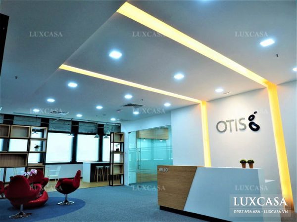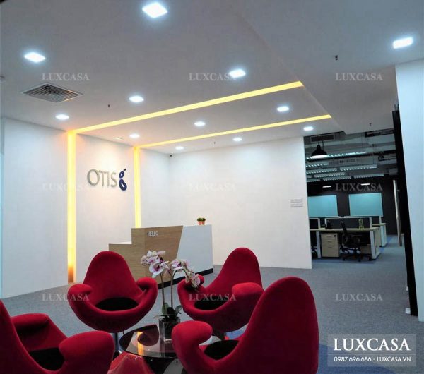 Khu vực lễ tân và sảnh chờ của văn phòng Otis được thiết kế ấn tượng, độc đáo. Tên thương hiệu và logo được gắn nổi bật giữa trung tâm bức tường của quầy lễ tân. Phần đèn led âm trần kết hợp với đèn led tuýp dài tạo thành hai đường thẳng song song tạo nên điểm nhấn cho khu vực lễ tân. Điểm nổi bật của khu vực sảnh chờ là bộ bàn ghế đỏ với thiết kế độc đáo. Việc lựa chọn bộ bàn ghế đỏ thiết kế độc – lạ giúp tạo cảm giác bắt mắt, thu hút đối với những khách. Đặc biệt, trong thiết kế nội thất, màu đỏ là màu tạo cảm giác ấm áp và hiện đại rất phù hợp với khu vực sảnh chờ, tiếp đón khách.