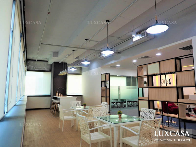 Khu vực nghỉ ngơi, thư giãn của nhân viên được thiết kế ấn tượng với điểm nhấn là những bộ bàn ghế với tông màu trắng và đền trần thả màu bạc. Với thiết kế lung linh ấn tượng, khu vực này chẳng khác nào một quán cafe hay quầy bar để nhân viên có thể thư giãn giữa giờ làm việc, thưởng thức hoa quả, đồ uống, tổ chức liên hoan trong những dịp đặc biệt. Khu vực nghỉ ngơi, thư giãn được ngăn cách với khu vực sảnh chờ và quầy lễ tân bằng kệ trang trí gỗ vô cùng bắt mắt. Việc sử dụng kệ trang trí thay vì vách ngăn tạo cảm giác các không gian mở, thoáng đãng, rộng rãi.