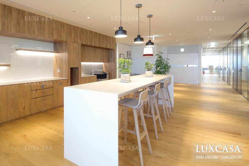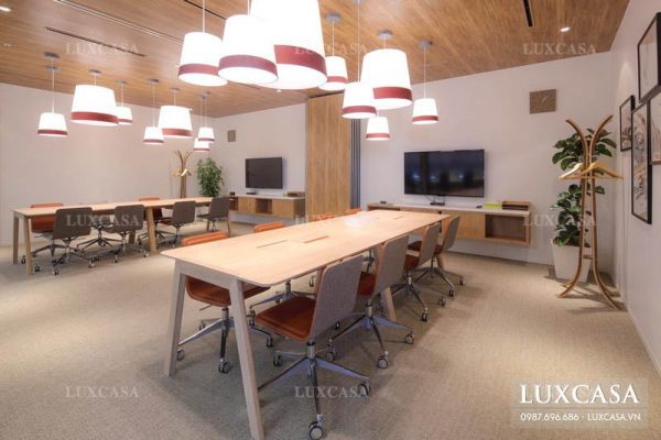 Đối với phòng họp, Luxcasa đã khéo léo thay thế bộ bàn 6 ghế với bằng bộ bàn dài để tiện lợi hơn trong những cuộc họp đông thành viên tham gia. Màn hình chiếu tivi màn hình lớn, độ phân giải cao giúp các thành viên dễ dàng hơn trong quá trình theo dõi cuộc họp.