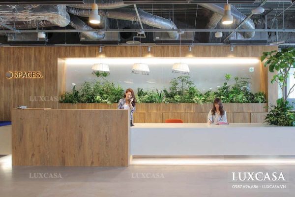 Sảnh quầy lễ tân công ty SPACES với bức tường cây xanh