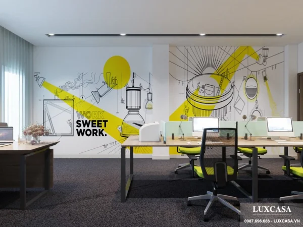 Thiết kế sắp xếp công ty IT diện tích nhỏ cùng các bức tranh tường trang trí ấn tượng sẽ thổi làn gió mới cho các văn phòng cũ. Bí quyết tân trang với các startup tiết kiệm chi phí thuê mặt bằng.