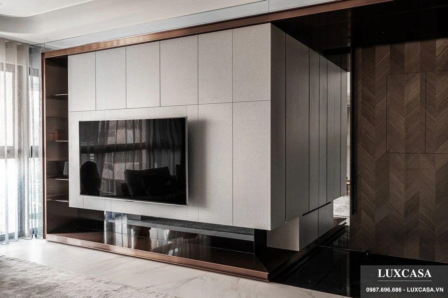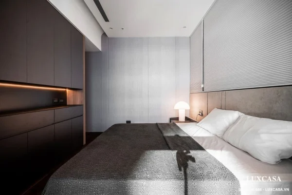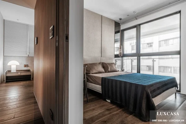 Công ty Luxcasa nhận thi công trọn gói các công trình, cung cấp nội thất theo yêu cầu và bảo hành, bảo trì lâu dài. Tại mỗi phòng ngủ bố trí kê đặt giường, tủ, bàn phấn trang điểm vuông góc với cửa sổ. Cửa sổ kính kích thước lớn với rèm kéo đón ánh sáng tự nhiên tối đa. Chất liệu cửa kính khung thép vừa cách âm lại giảm ồn hiệu quả.