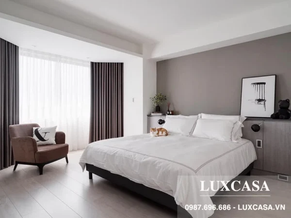 Thiết kế thi công phòng ngủ chung cư theo sở thích, tuổi mệnh của người dùng. Cửa sổ có 2 lớp rèm che điều chỉnh cường độ sáng. Tủ kê đầu giường vừa làm điểm tựa và chỗ đặt phụ kiện, vật dụng nhỏ. Công ty sản xuất nội thất theo yêu cầu LUXCASA đã cung cấp mẫu ghế đơn bọc vải dựa trên kích thước đặt hàng. Sàn nhà ốp gỗ hạn chế ồn.