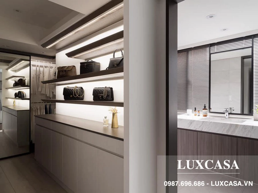 Khách hàng muốn có 1 phòng, khu riêng để chứa quần áo, phụ kiện đồ dùng nên kts tận dụng góc lối đi làm nơi đặt tủ quần áo, túi xách, phụ kiện. Sản xuất, lắp đặt mẫu tủ đồ kèm gương kết hợp điện chiếu sáng theo tầng giúp người dùng có thể chọn, phối đồ và nhìn mẫu nhanh hơn.
