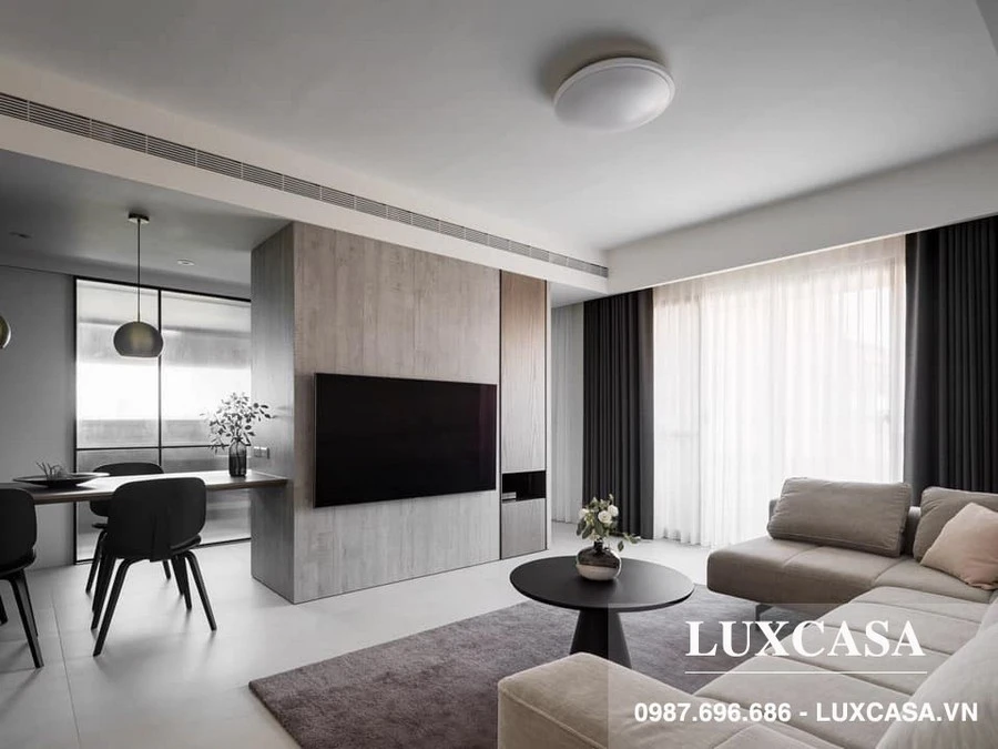 Màu sắc căn hộ phối theo phong cách trung tính với 3 màu chính là đen, xám, trắng ngà. Bàn ghế tiếp khách đặt trên thảm vải để phân tách khu vực. Sopha góc chữ L dùng vải nỉ cao cấp làm vỏ bọc đặt hướng nhìn về tivi. Bàn trà gỗ tròn màu đen đặt chính giữa. Để giảm bớt số lương vật dụng, KTS tư vấn khách hàng lắp tivi áp dường thay vì kiểu dùng kệ kê truyền thống.