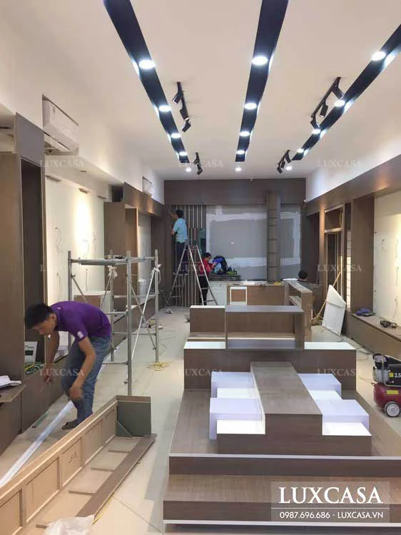 Thi công lắp đặt quầy kệ, bàn ghế ngồi trong showroom theo đúng bản vẽ thiết kế