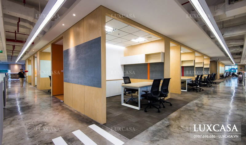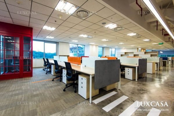 Các dãy bàn ghế làm việc sắp xếp song song thành từng hàng, giữa là lối đi. Mỗi vị trí ngồi tại các bàn làm việc dài đều có tủ đựng tài liệu, vách ngăn lơ lửng đủ để tạo không gian riêng mà không kín khít. Trần ô vuông với hệ thống ánh sáng ốp trần màu trắng tương phản với sàn nhà tối màu.