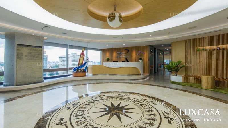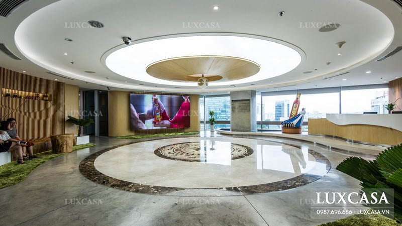 Ngay từ khi bước vào cửa công ty, một hoạ tiết trống đồng to đặt chính giữa sảnh đã tạo nên một không gian bắt mắt. Chiếc bàn lễ tân hình chữ nhật ốp khối trắng bên trên được bố trí gần ô cửa sổ có kính chắn. Đằng sau là tường gỗ màu vàng có in logo tên công ty. Bên trái quầy lễ tân là hình sản phẩm mô phỏng của công ty, bên phải là khu vực chờ của khách, ở giữa là hành lang dẫn vào bên trong. Với mặt bằng khá rộng, khu vực sảnh chờ của công ty được kết hợp bên cạnh quầy lễ tân. Không gian này được các kiến trúc sư của Luxcasa sáng tạo với việc kết hợp các dãy ghế ngồi uốn cong đặt sát vào các bờ tường nhỏ. Nhờ vậy không gian thêm rộng rãi, sang trọng.