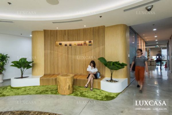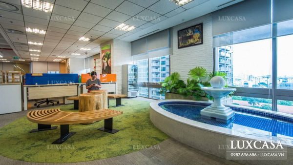 Ngay bên cạnh khu vực làm việc chung của các nhân viên trong công ty là một mô hình hồ nước trong xanh đặt cạnh cửa sổ. Không gian này được dùng làm nơi nghỉ giữa giờ, giải tỏa căng thẳng trong công việc cho các nhân viên. Hồ nước trong veo với bụi cây xanh mát tạo nên không gian thoải mái, thư giãn.