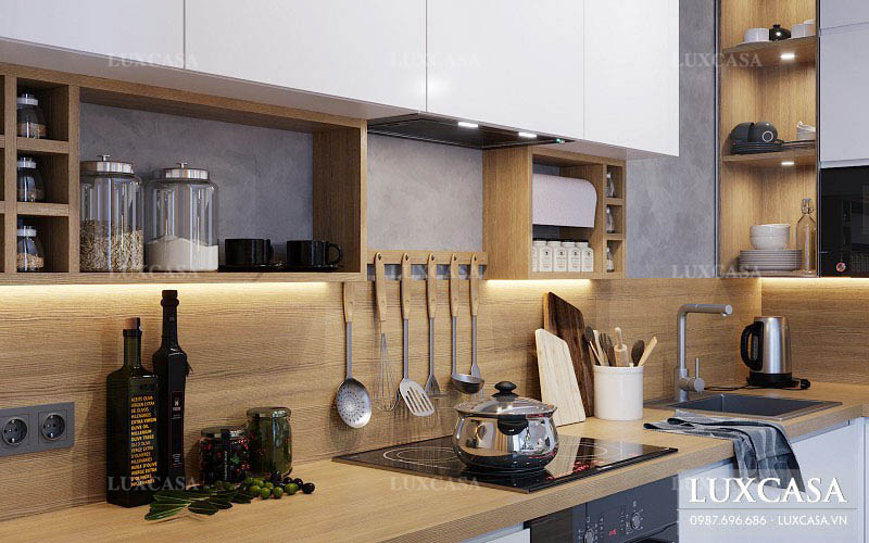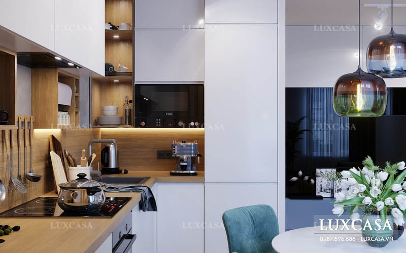 Thiết kế không gian mở cho phòng bếp và phòng khách Bố trí phòng bếp nhỏ gọn với tủ cao tiết kiệm không gian