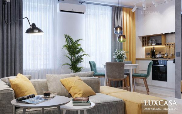 Xu hướng thiết kế chung cư mới nhất hiện nay là không gian mở và có bố trí cây xanh. Hãy đặt thêm cây xanh ở phòng khách tạo sự sang trọng và hiện đại. Đây là cách giảm bớt sự ngột ngạt, tạo cảm giác thoải mái, thân thiện. Vật dụng trong bếp và phòng khách không cần quá nhiều.