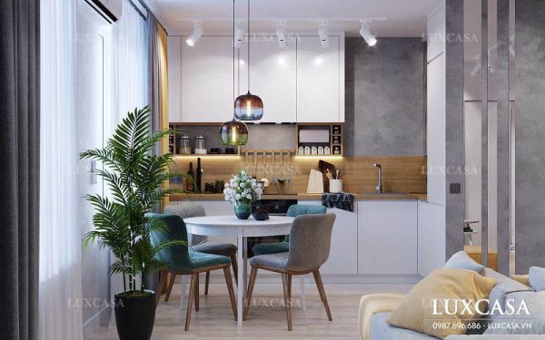 Đối với phòng bếp, phòng khách, phòng ngủ, nhà vệ sinh bạn cần bố trí nội thất sao cho khoa học. Phòng bếp và phòng khách nên có đồng tông màu sáng trắng. Không gian mở giữa hai phòng này sẽ giúp căn hộ thêm rộng rãi hơn.