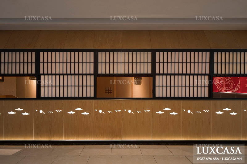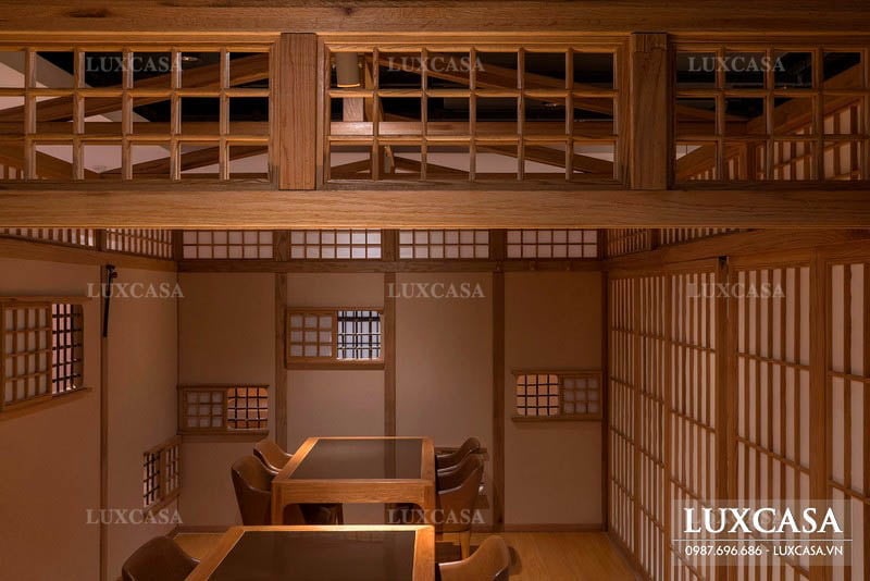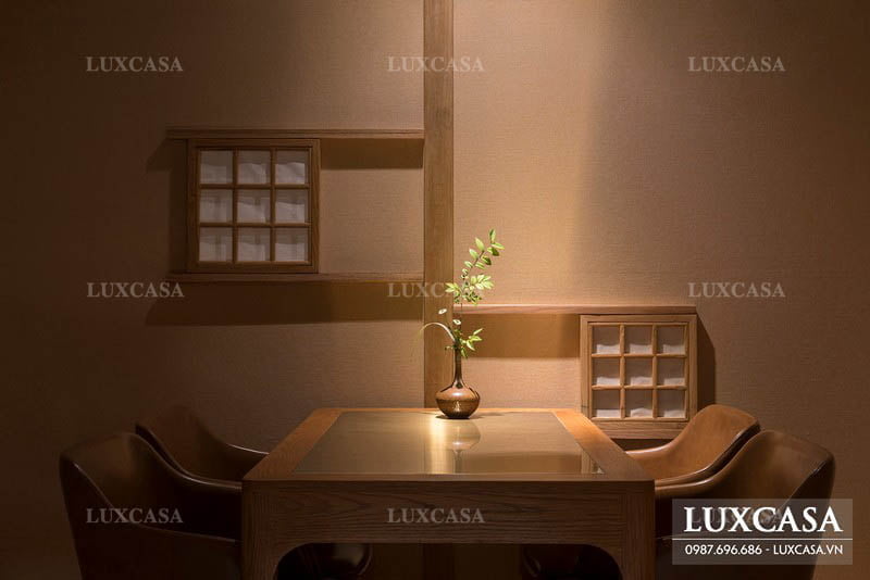 Như chúng ta đã biết, yếu tố quan trọng nhất trong các thiết kế nội thất nhà hàng Nhật Bản chính là sự gọn gàng nhưng phải đảm bảo yếu tố thẩm mỹ và tiện nghi. Do đó, khi thiết kế nội thất chi tiết cho các phòng ăn, Luxcasa đã bố trí các sản phẩm nội thất đơn giản, vừa đủ với những bộ bàn ghế ăn bằng gỗ tự nhiên. Phần cửa ra vào được thiết kế dạng trượt ngang với các nguyên liệu chính là gỗ và giấy – một phong cách đậm chất Nhật Bản,