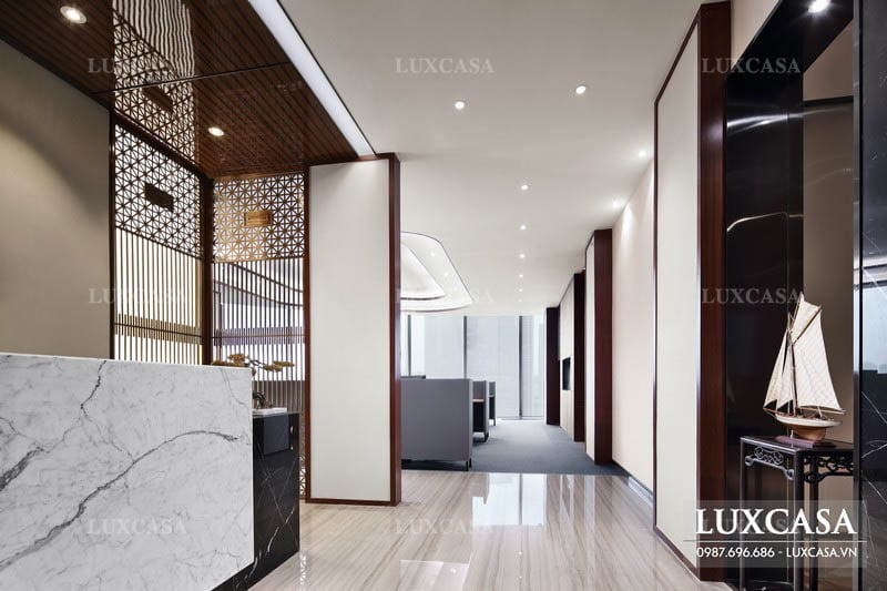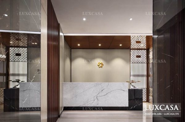 Bàn lễ tân kiểu dáng hình chữ nhật đơn giản làm từ chất liệu đá tự nhiên 2 màu đen – trắng. Phía sau bàn là biểu tượng của công ty với màu vàng đồng hợp kim nổi bật. Bên cạnh bàn là cây bonsai nhỏ làm giảm sự đơn điệu, cứng nhắc. Các tấm gỗ trắng kết hợp cùng vách nan gỗ tự nhiên, gỗ veneer khung thép màu nâu đỏ nhằm gia tăng điểm nhấn.