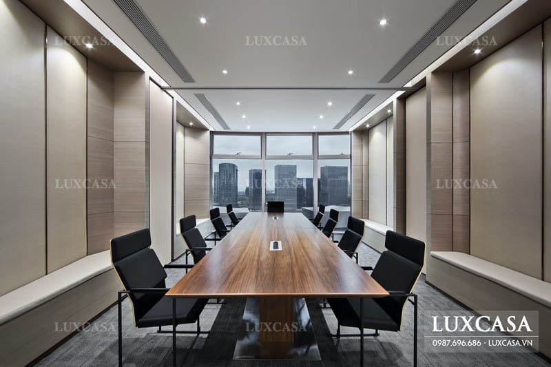 Phòng họp kết hợp phòng tiếp khách nên các thiết bị trong không gian này được chủ đầu tư yêu cầu chất lượng cao và thẩm mỹ. Bàn họp dài gỗ tự nhiên hình chữ nhật cùng ghế da màu đen sang trọng giúp căn phòng trở nên quyền quý hơn. Khi thi công phòng họp hiện đại theo yêu cầu này, kiến trúc sư đã lựa chọn vách ngăn gỗ công nghệp và hệ cửa kính khung thép để đạt được hiệu quả cách âm và thu sáng.
