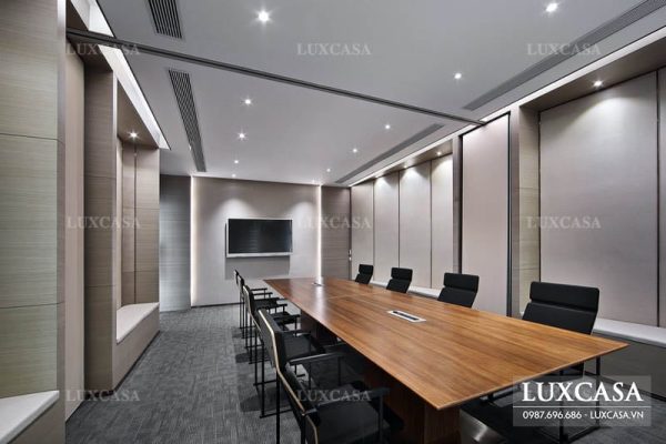 Trong phòng họp có lắp đặt thêm 1 màn hình tivi để phục vụ cho việc trao đổi, cung cấp thông tin được lắp đặt ở chính giữa phòng. Khi thiết kế thi công trọn gói văn phong cao cấp ở Thanh Xuân này, KTS công ty Luxcasa đã tư vấn khách hàng lựa chọn lắp đặt hệ thống thông gió, điều hòa sát trần để tăng cảm giác mỹ quan, tránh xuất hiện các thiết bị cồng kềnh gây rối mắt. Đồng thời hạn chế tối đa dùng nhiều màu sắc nóng, pha trộn quá nhiều sẽ làm giảm tính sang trọng của đồ vật.