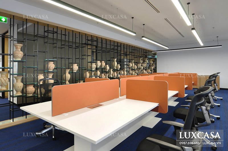 Bạn có thể thiết kế một chiếc kệ sắt cao kịch trần với các ô nhỏ để trưng bày các sản phẩm bình gốm. Kệ sắt này nên thiết kế các ô so le nhau và phủ sơn màu đen sang trọng, đẳng cấp. Bên cạnh đó, những chiếc bình gốm trang trí nên được lựa chọn với màu kiểu dáng đa dạng nhưng có chung màu sắc nhẹ nhàng, tinh tế. Xu hướng thiết kế nội thất phòng làm việc nhân viên này sẽ giúp không gian văn phòng làm việc được “lột xác”.
