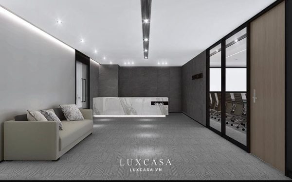 Sảnh chờ công ty có đặt bàn lễ tân và 1 sofa văng phong cách hiện đại. Bàn lễ tân phủ vân đá cùng thương hiệu công ty là điểm nhấn chú ý cho không gian này. Ghế sofa văng sảnh chờ êm ái để các vị khách đến công ty được thoải mái, mà vẫn trang trọng lịch sự