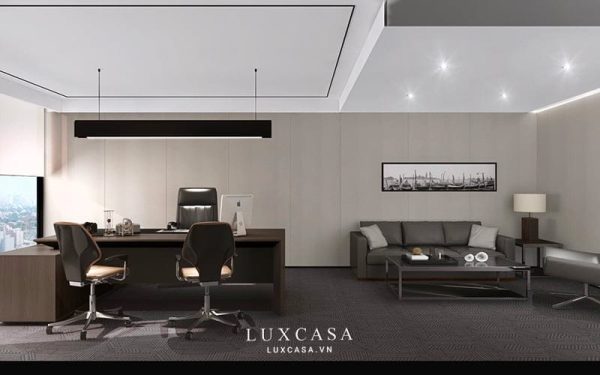 Khu vực làm việc gồm bàn lãnh đạo làm từ gỗ tự nhiên cao cấp ghế ngồi bọc da và 2 ghế đơn nhỏ. Trần phía trên bàn dùng đèn dây thả khổ lớn dài gần hết bàn nhằm mang đến ánh sáng đồng đều.
