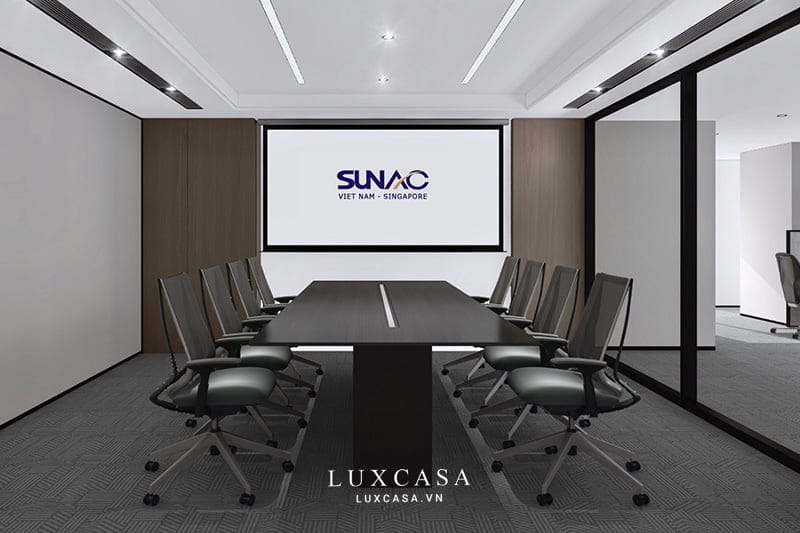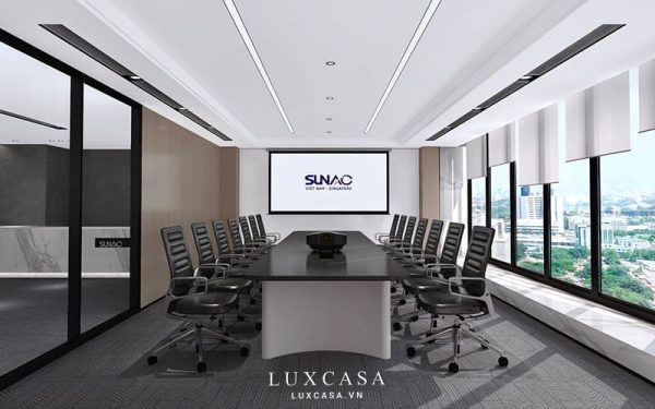 Thiết kế văn phòng trọn gói hiện đại công ty SUNAC với phòng họp được bố trí cạnh sảnh chờ với cửa kính sáng màu, giảm ồn nhưng vẫn có thể quan sát tình hình bên ngoài phòng. Do số lượng thành viên tham gia trực tiếp ít, thường kết nối trực tuyến nên đã bố trí màn hình chiếu kích thước lớn. Trong bản vẽ thiết kế phối cảnh công ty, kiến trúc sư Luxcasa đã sử dụng mẫu bàn ghế đơn giản, tiện lợi: Bàn họp dài hình chữ nhật cùng các ghế chân có con lăn di động.